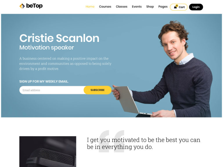 デモにはすべて、訪問者がニュースレターに参加してサービスに関する最新情報を受信トレイに直接送信できるメール登録フォームや、コーチングクライアントからのフィードバックをオンラインで簡単に共有できる紹介文パネルなどの便利な要素が含まれています。 電子書籍、オンラインコース、またはWordPress Webサイトからのその他のデジタルダウンロードなどのコンテンツを販売する場合、BeTopはこの機能を実装するために必要なすべてのプラグインと連携します。