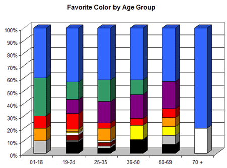 年齢層を問わず、最も人気のある色は青です。 しかし、1 歳から 35 歳までの若者は、緑、紫、赤、オレンジなどの明るい色を好む傾向も見られました。