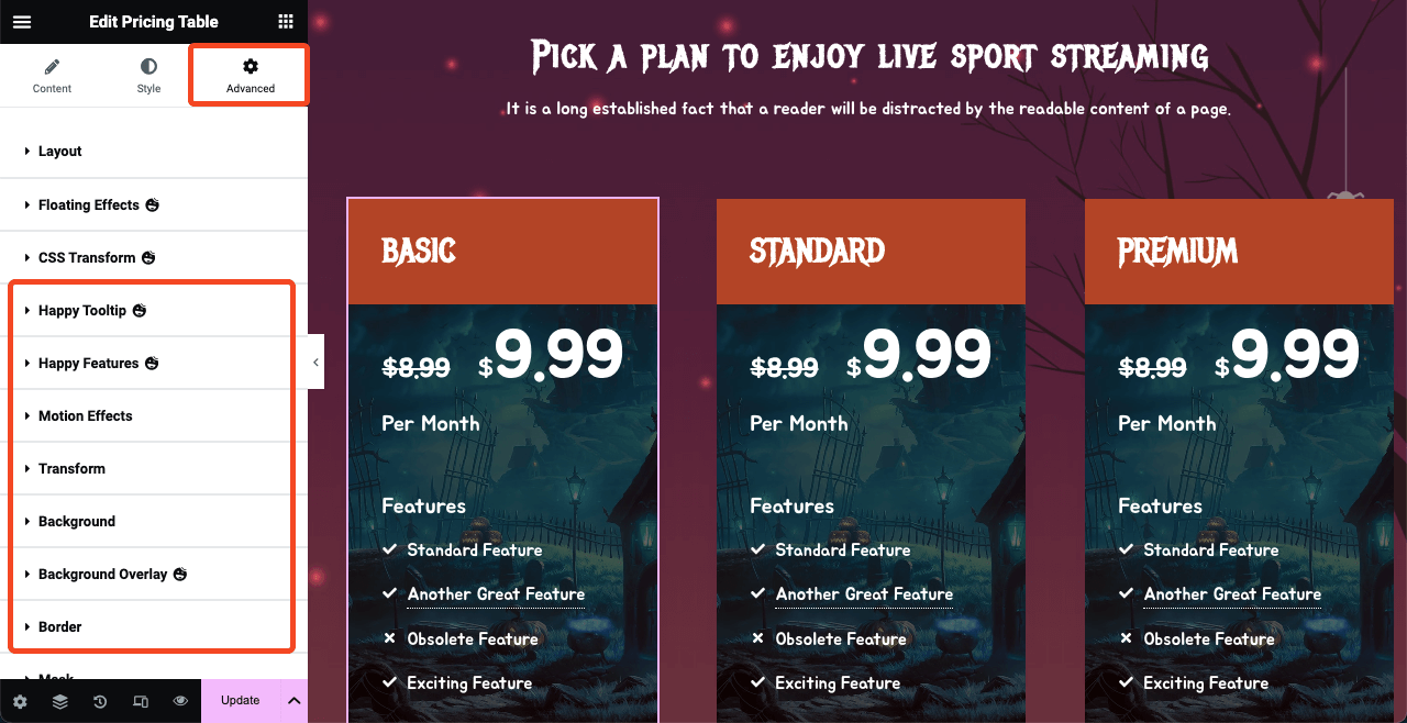 さらにカスタマイズ オプションを表示するには、 [詳細設定]タブに移動します。 ハッピー ツールチップ、ハッピー フィーチャー、モーション エフェクト、変換、背景、背景オーバーレイ、境界線などのオプションを調べます。 価格表の背景を背景オプションから変更しました。