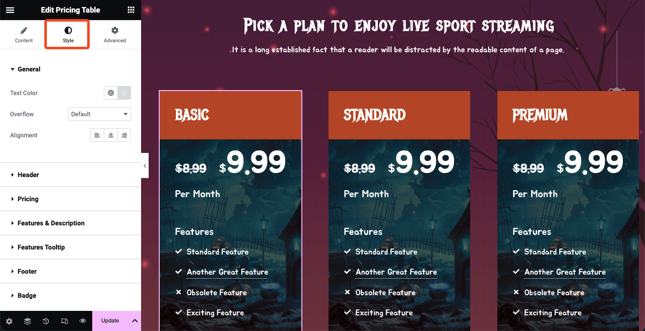 スポーツのライブストリーミング サービスを販売しているとします。 そして、このサービスに対して毎月顧客に料金を請求します。 次に、デモ価格表を作成します。 HappyAddons には、手間をかけずにすぐに実行できる価格表ウィジェットがあります。
