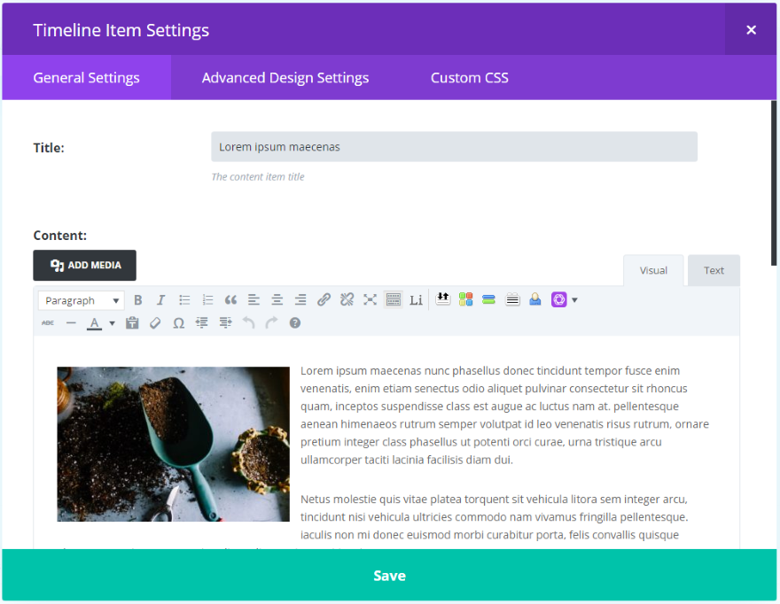 [新しいタイムラインアイテムの追加]をクリックすると、テキスト、メディア、ラベル、その他のボタン、アイコン、アイコンの色、背景色、画像/アイコンのアニメーションを備えたコンテンツエディターが開きます。 また、すべての標準の詳細設計設定とカスタムCSSも含まれています。