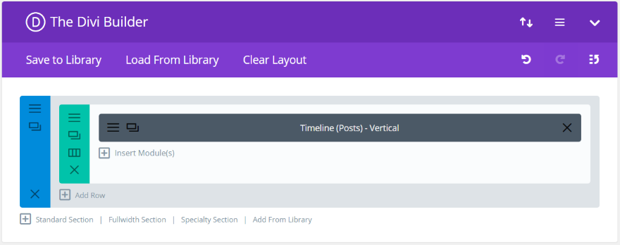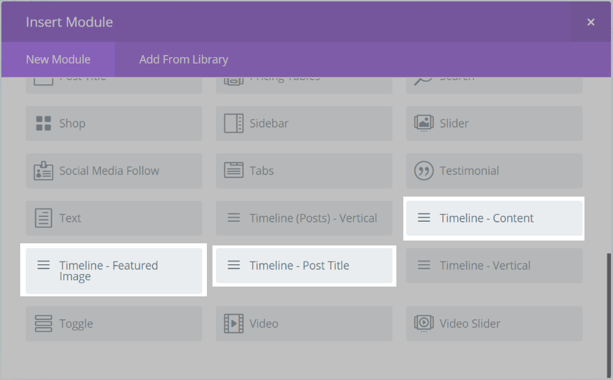 注–これらのモジュールは、ほとんどのDiviBuilderモジュールのようにページ内では使用されません。 これらは、タイムライン(投稿)–垂直モジュールによって呼び出されるレイアウト内で使用することを目的としています。
