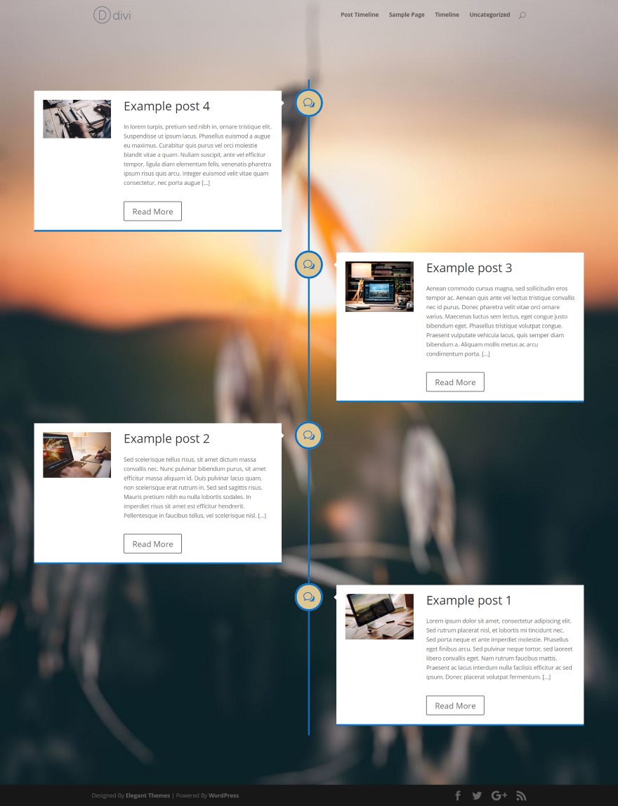 結果は、タイムライン上の私の最新の投稿を含むブログページです。 背景画像の上にタイムラインを配置しました(画像はセクションに追加されます)。 このモジュールでは、アイコンはグローバルです。 タイムラインを青に設定し、背景は黄褐色のアイコンと青いアイコンを使用しました。 投稿モジュールは、詳細デザイン設定を使用して、ページに一致するようにさらにスタイルを設定できます。