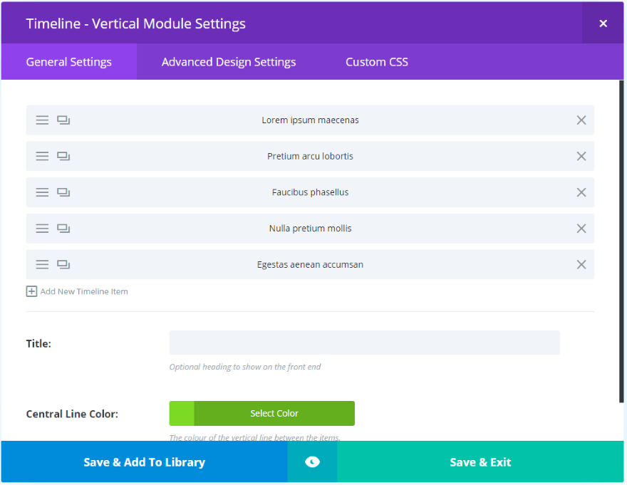 [一般設定]で、新しいタイムラインアイテムを追加したり、タイムラインのタイトルを指定したり、タイムラインの色を選択したりできます。 [新しいタイムラインアイテムの追加]をクリックして、各タイムライン要素を作成します。