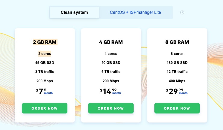 彼らは VPS ホスティングに関して異なるプランを持っています。 月額 7.5 ドルから始まるアンマネージド サーバーと、月額 11.4 ドルのマネージド ISP マネージドおよび CentOS サーバーから選択できます。