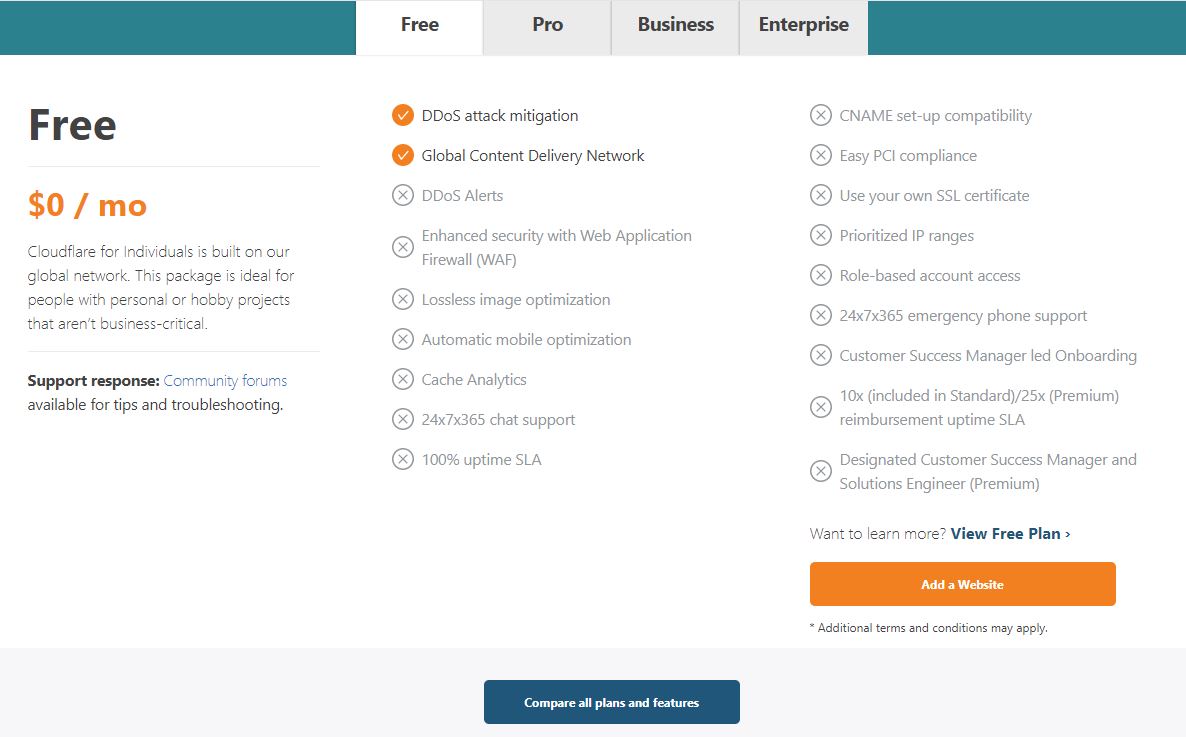 性能だけでなく価格にも大きな違いがあります。 1か月あたり約10GBのトラフィックを受信する小規模なニッチビジネスを運営している場合は、プレミアムパッケージにお金をかける必要はありません。 たとえば、無料のCloudflare CDNは、いつでもアップグレードできる仕事をします。