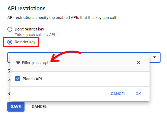 Places API のみが必要なので、ドロップダウンから選択しましょう。 要件に応じて、Maps JavaScript API などの API を有効にして追加できます。