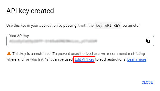 これにより、新しいAPI キーが生成されます。 ただし、API キーをコピーする前に、いくつかの制限を追加する必要があります。 そのためには、[キーの編集] をクリックします。