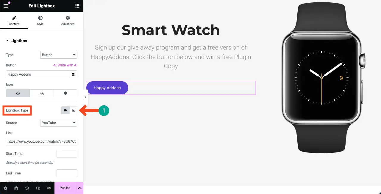 ウィジェットには、ボタンと画像の2つのライトボックスタイプが付属しています。ウィジェットに必要なライトボックスの種類を選択します。このチュートリアルでは、ボタンタイプを使用しています。