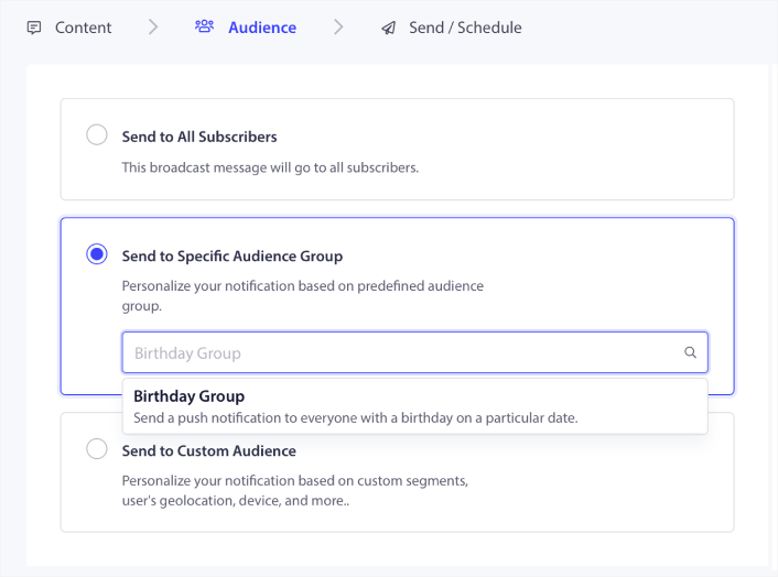 プッシュ通知購読者リストのセグメントは、主に購読者の興味と閲覧行動に基づいています。 ただし、オーディエンス グループを使用すると、さらにいくつかのステップを進めることができます。
