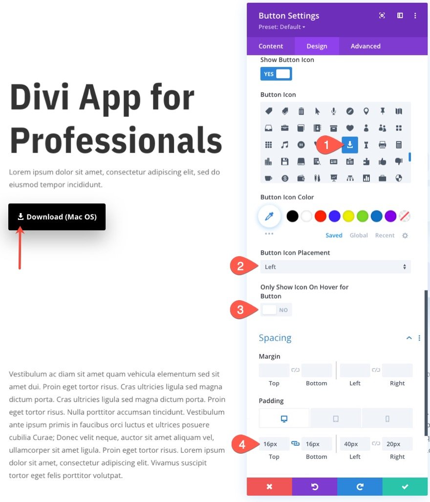 最初のボタンでは、Diviの条件オプションを使用して、MacOSでのみダウンロードボタンを表示します。 これを行うには、レイアウトのヘッダーにある既存のボタンの設定を開き、次のボタンのテキストとリンクURLを更新します。