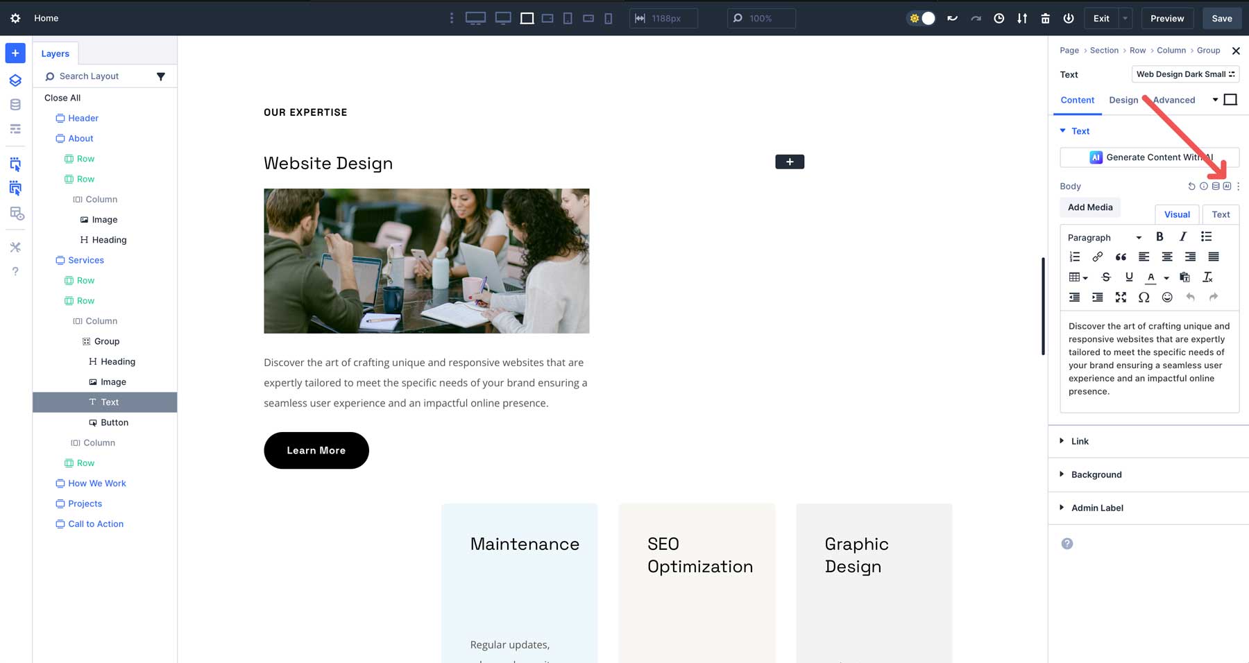 既存のテキストモジュールでDivi AIを使用するには、テキスト領域の上にホバリングし、[コンテンツ]タブのDivi AIアイコンをクリックします。