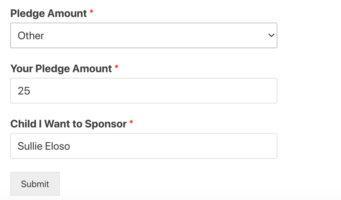 次に、先に進み、ドロップダウンをフォームにドラッグします。 ラベルテキストをPledgeAmountに変更し、いくつかのオプションを追加しましょう。