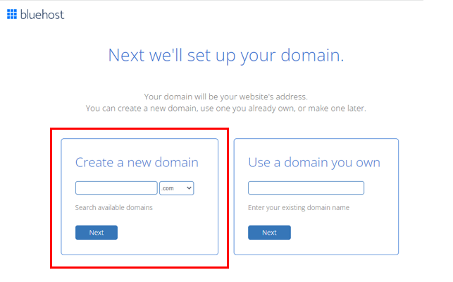 プランを選択すると、ドメイン設定ページに移動します。 ドメイン名がないため、[新しいドメインの作成] オプションを選択します。 次に、[次へ] ボタンをクリックします。