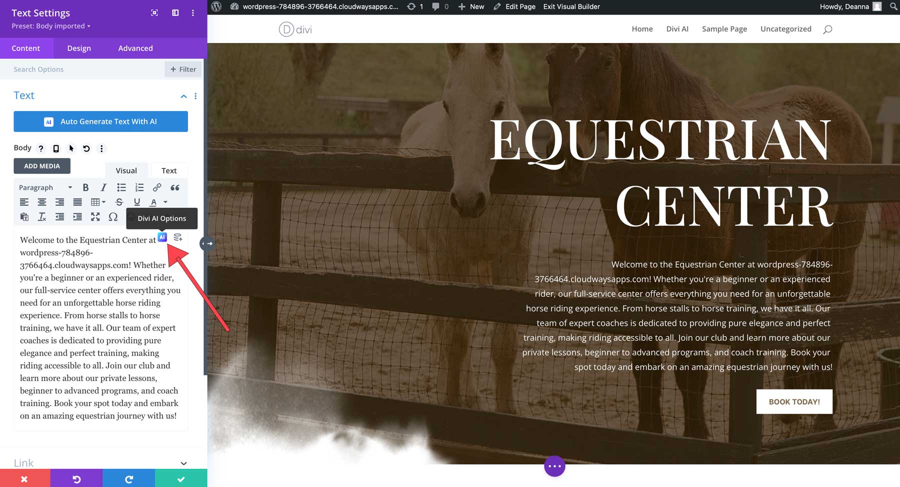 Divi の強力な AI 機能を活用する最良の方法は、Divi のコード不要の Visual Builder を使用することです。 こうすることで、ページのデザインをリアルタイムで作業できます。 作業を簡単にするために、Divi 用の Horse Riding Layout Pack を使用して、Divi AI でコピーを改善します。 つまり、独自のコンテンツに従うことができます。