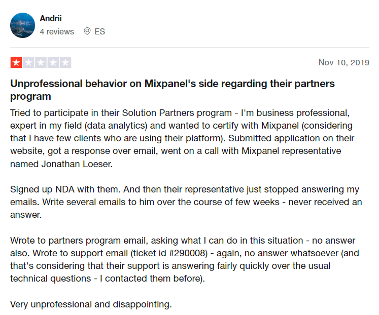 Trustpilot Web サイトの Mixpanel レビューに関するこのコメントによると、彼はパートナー プログラムやそのサポート チームにもメールを送信しましたが、いずれにしても回答はありませんでした。 残念ですね。