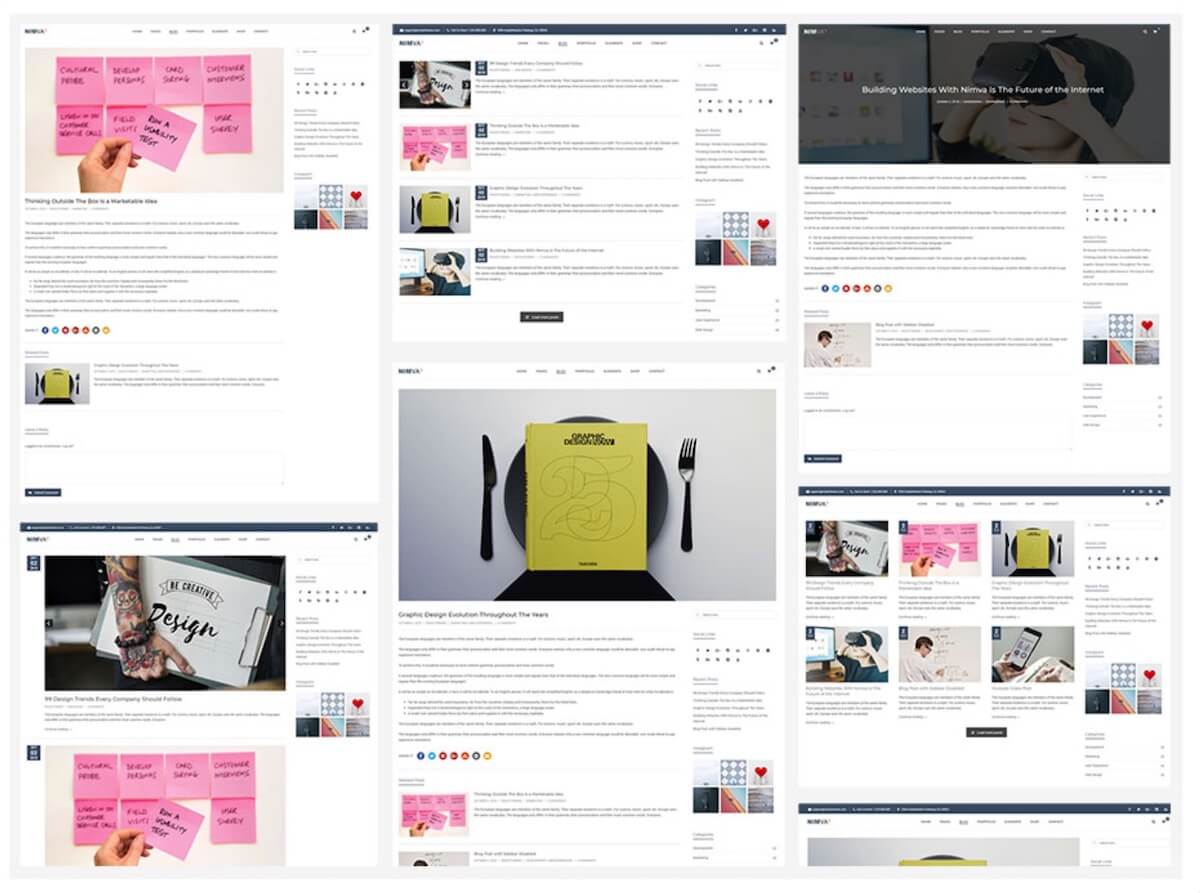 Nimva3 には、画像、コンテンツ、スライダー、投稿を含む 30 を超えるレイアウトが付属しています。 あらゆる種類の Web サイトをカバーする多様性があるため、ユースケースに関係なく、あなたに合ったレイアウトが見つかります。