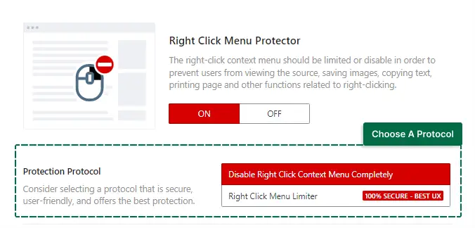 - 右クリック メニュー リミッター:このプロテクターは、右クリック メニューを制限します。 これは、ユーザーが新しいタブでリンクを開くなどの作業に右クリック メニューを使用できることを意味しますが、コピーと貼り付けとソースの表示は無効になります。 これは非常に安全で、Web サイトの UX にも影響しません。