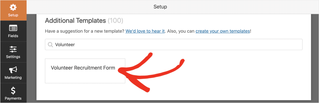 これを本当に簡単にするためにテンプレートを使用しましょう。 フォームテンプレートでボランティアフォームを検索し、テンプレートをクリックして開きます。