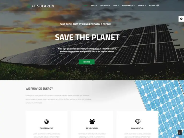 AT Solarenは、太陽エネルギー関連のビジネスWebサイト向けに調整されたJoomlaK2拡張スタイルテンプレートです。 まず、最新のBootstrapCSSFrameworkであるSupportFontAwesomeを使用してビルドします。 第二に、ATソラレンは財務面と環境面の両方でその利点を示しており、SEOと完全にレスポンシブなレイアウトがPCとモバイルベースで機能します。