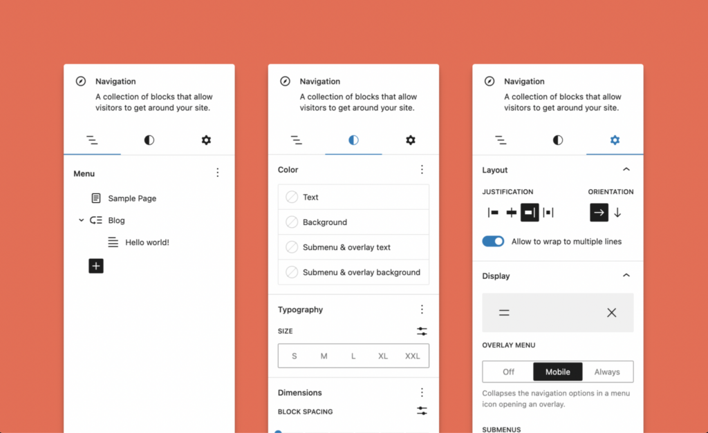 メニュー ブロックの編集時に右側のサイドバーにページ リスト ブロックが表示されるため、ナビゲーション メニューの編集が簡単になりました。 ページ上のブロックの左側のサイドバーのアウトラインでは、ナビゲーション ブロックのリスト ビューにより、ページ上のメニュー要素の移動と整理が簡単になります。