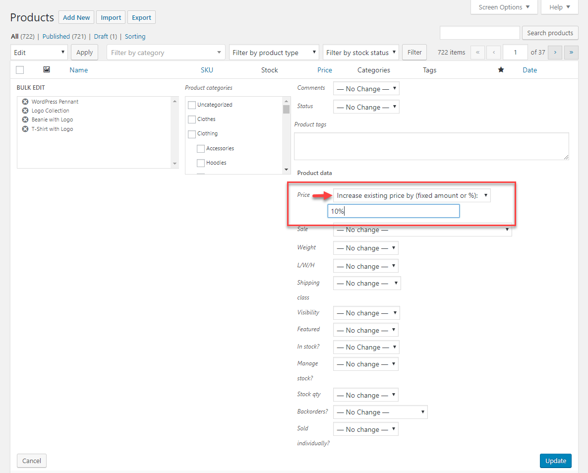 上記の4つの選択した製品の価格を上げるには、[価格]ドロップダウンフィールドから[既存の価格を(固定金額または%)増やす]オプションを選択できます。 「10%」と入力し、[更新]をクリックします。