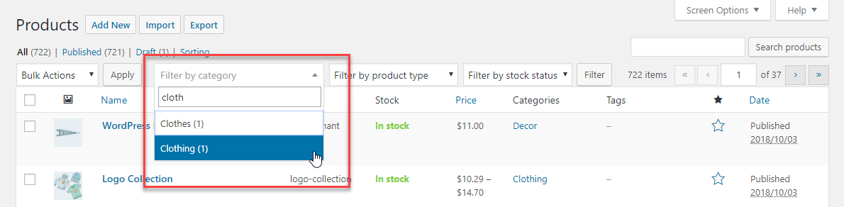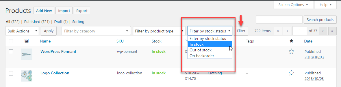 在庫状況で商品をフィルタリングすることもできます。 フィルタリングオプションを使用すると、要件に応じて、在庫あり、在庫なし、または入荷待ちの製品のみを選択できます。
