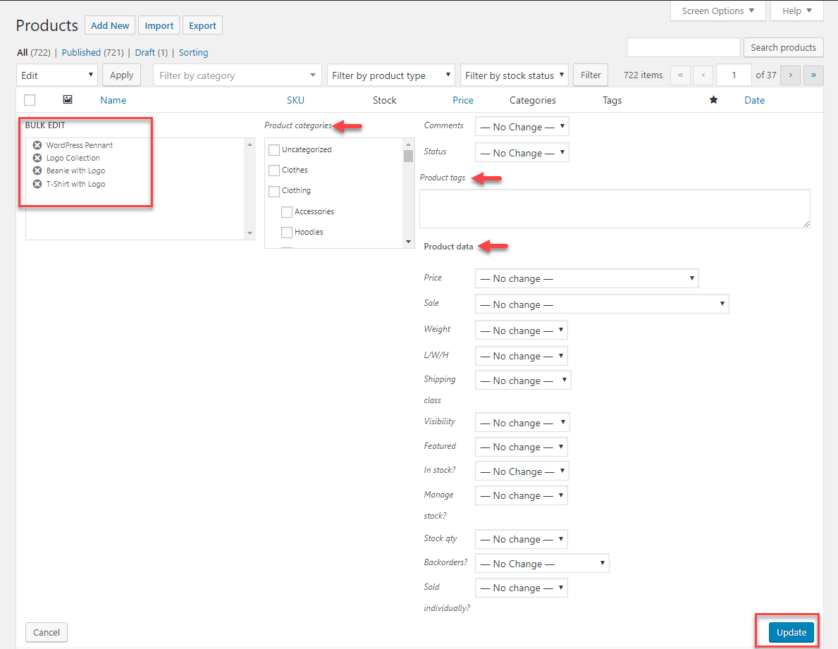 デフォルトでは、サイトの製品を一括編集するためのWordPress機能があります。 商品ページで、商品を選択し、一括編集オプションを選択できます。