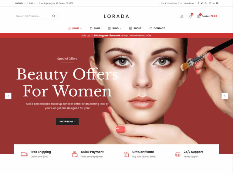 Loradaの使用方法に関係なく、このテーマには、化粧品店を成功させるために必要なすべてのものが含まれている必要があります。