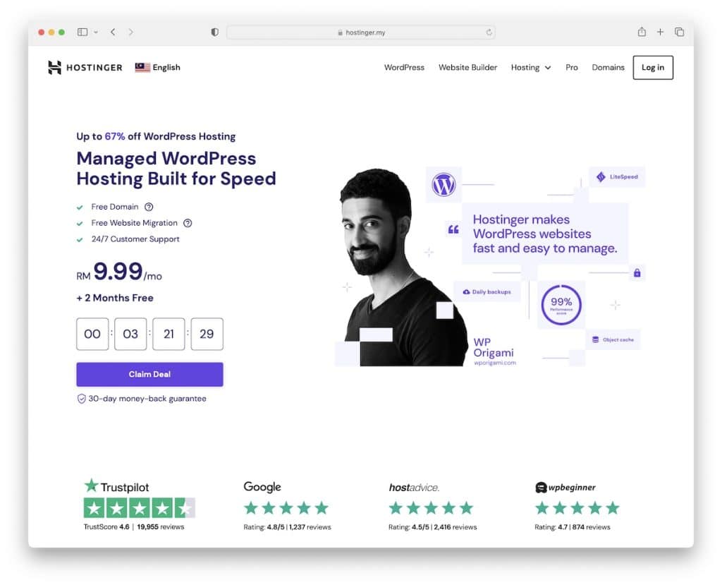 - Hostinger : マレーシアの初心者や中小企業に最適で、ユーザーフレンドリーなインターフェイスと 99.9% の稼働率保証を備えた、手頃な価格、高速、信頼性の高い WordPress ホスティングを提供します。
