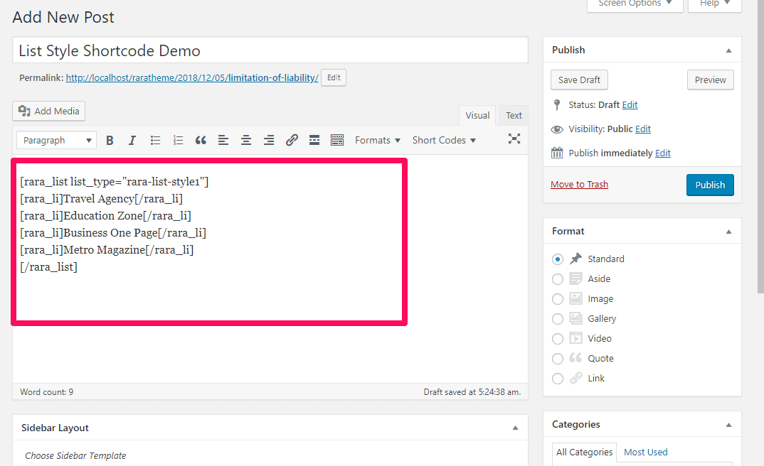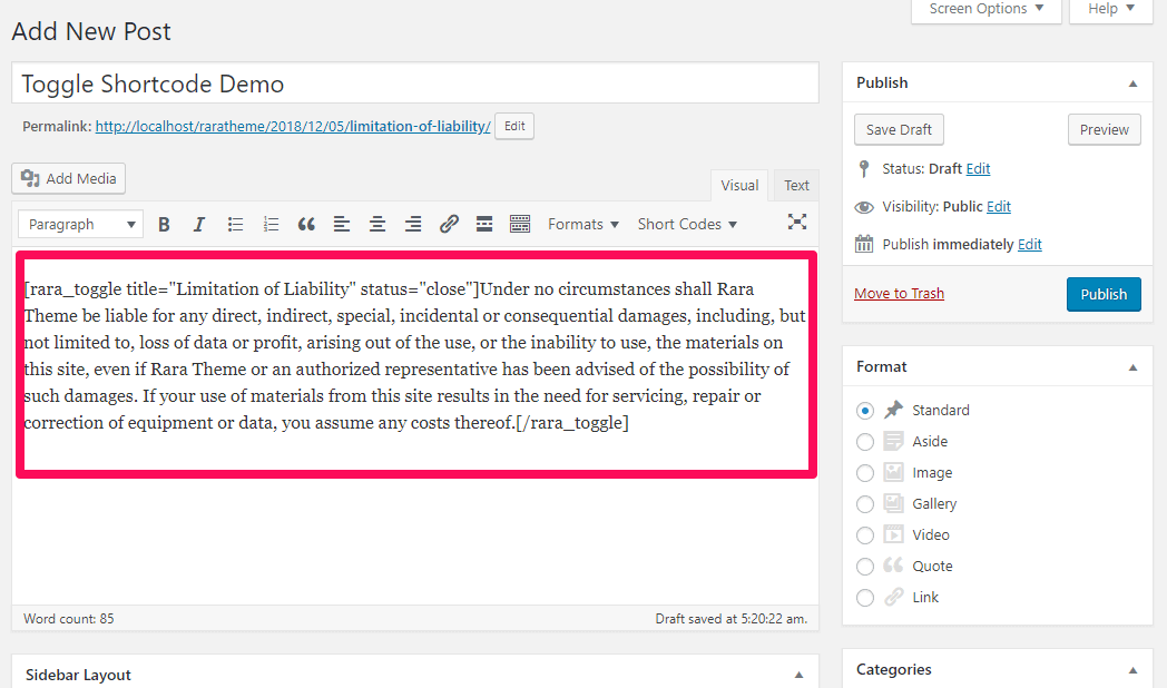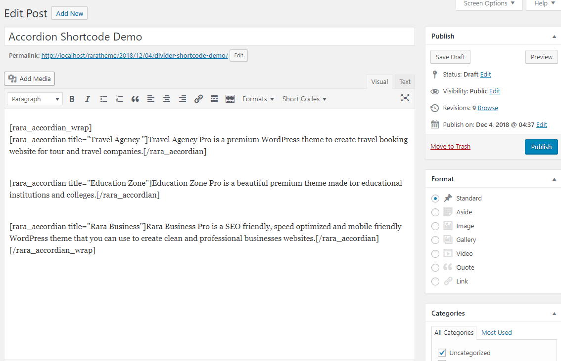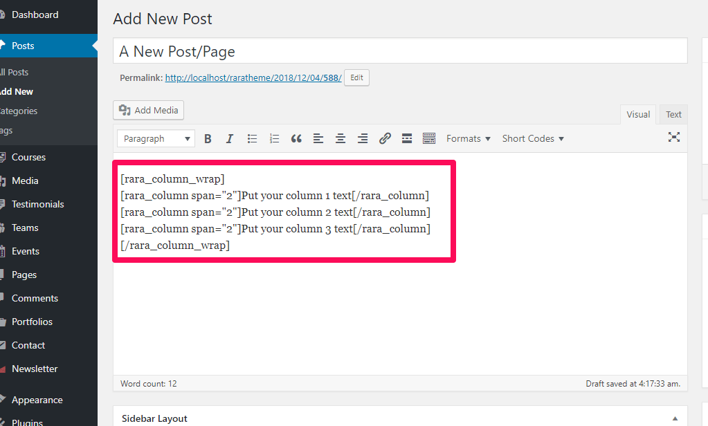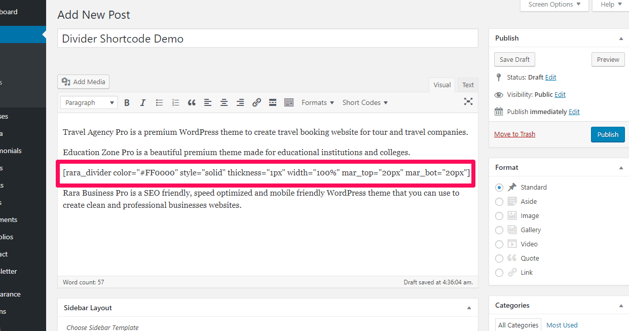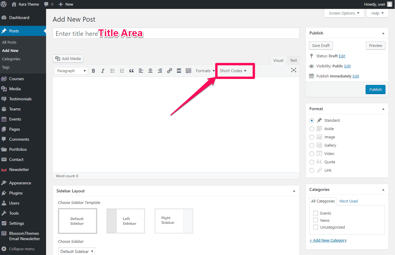 Raraテーマのショートコードを使用するには、次の手順に従ってください。