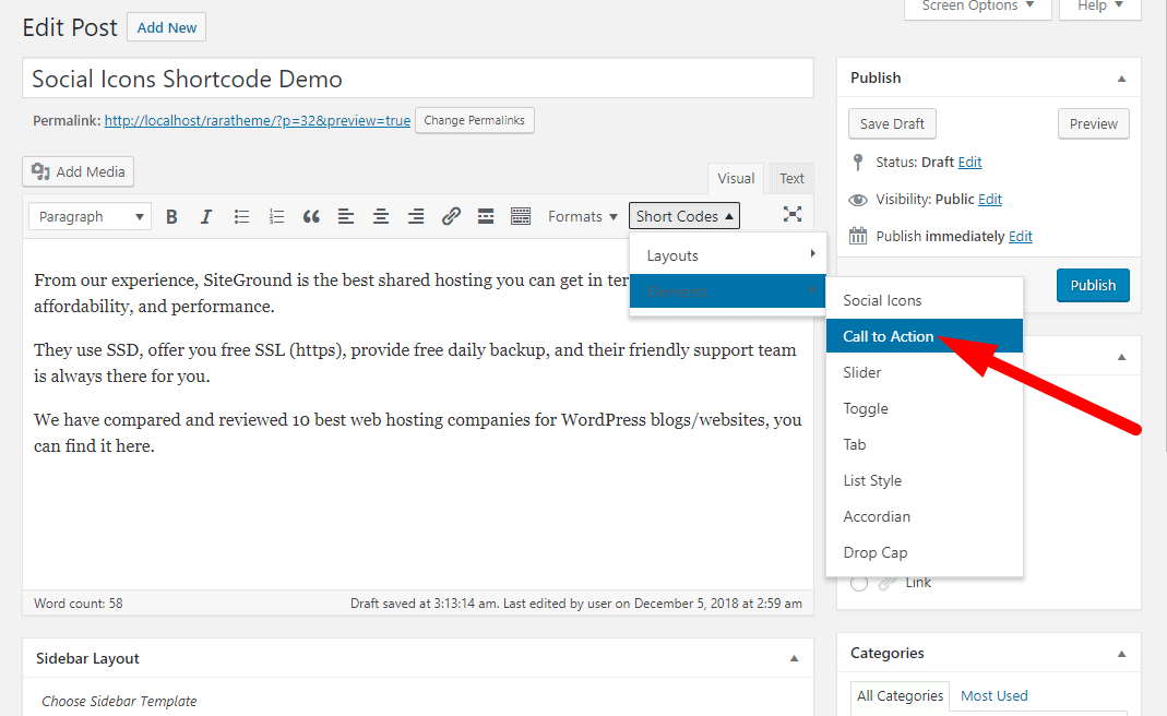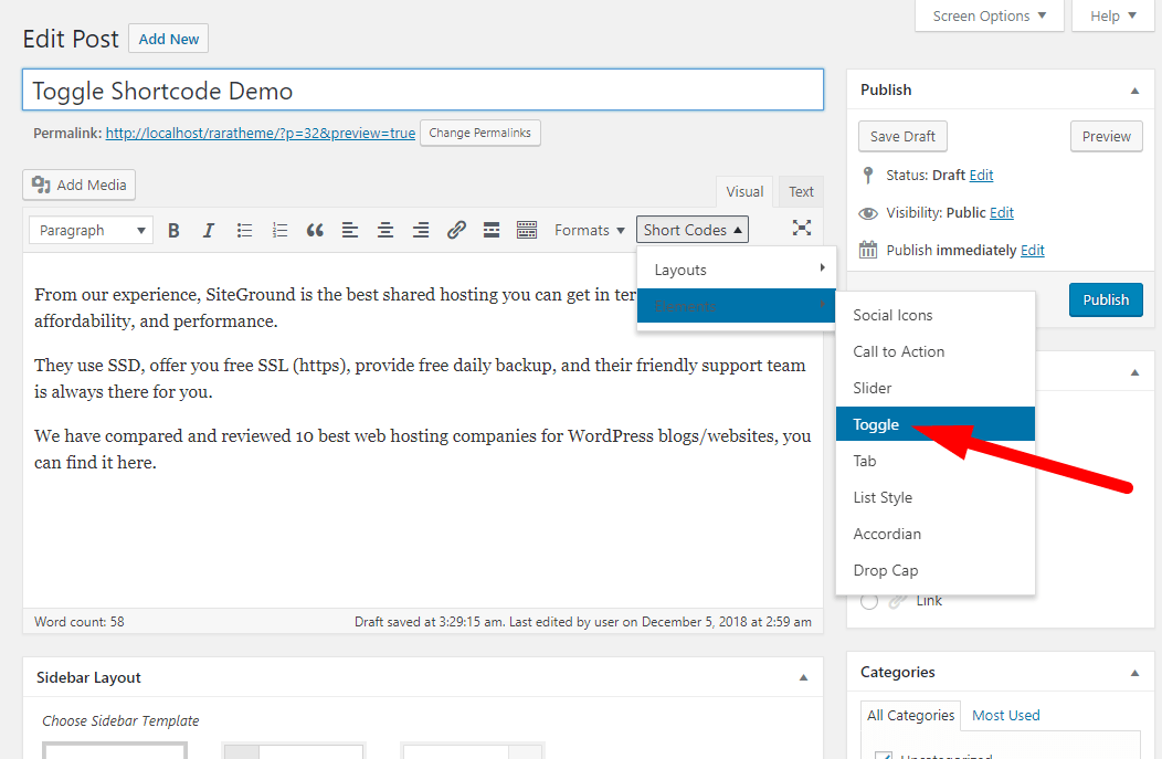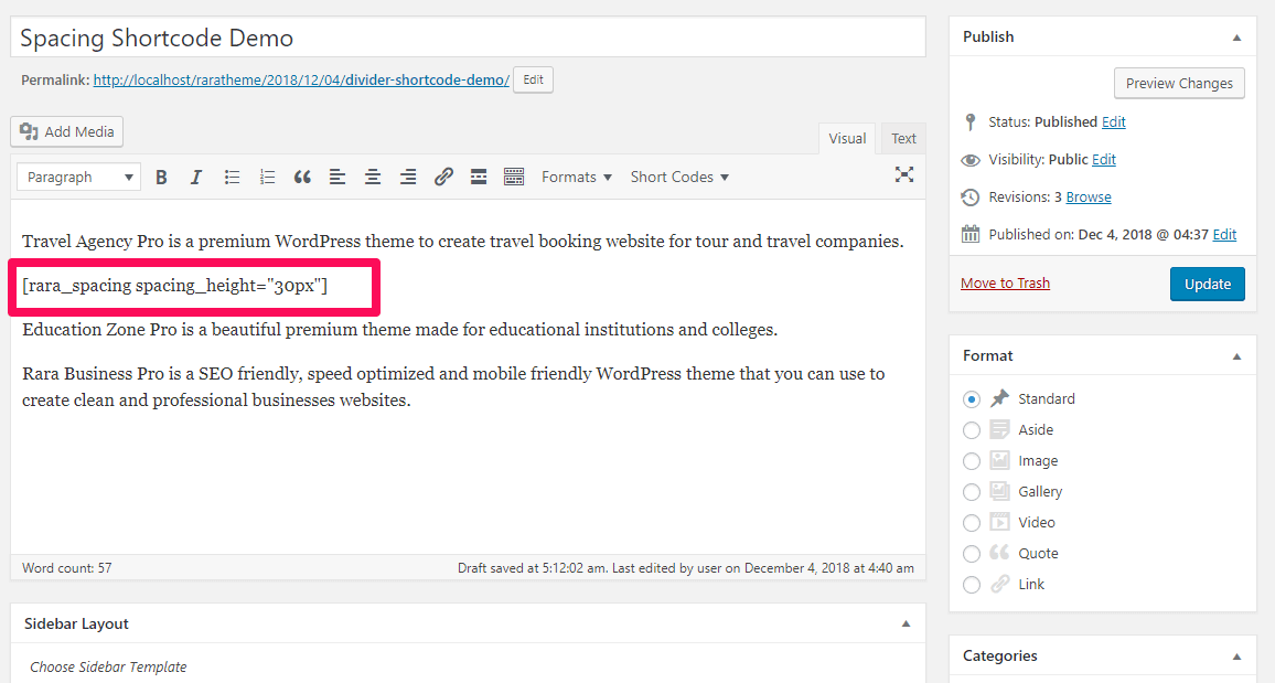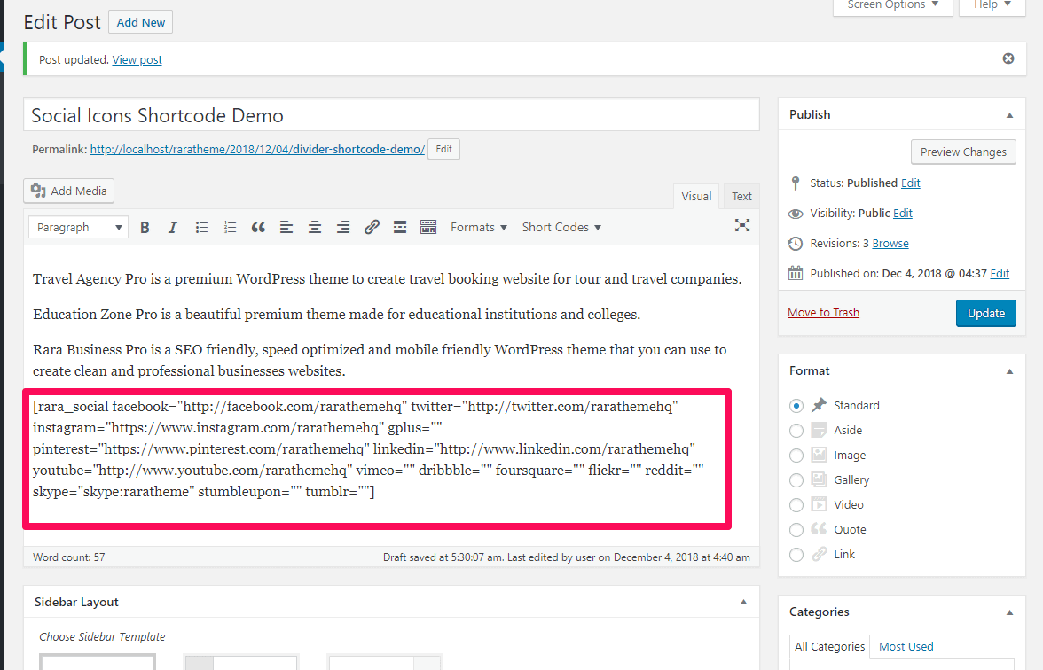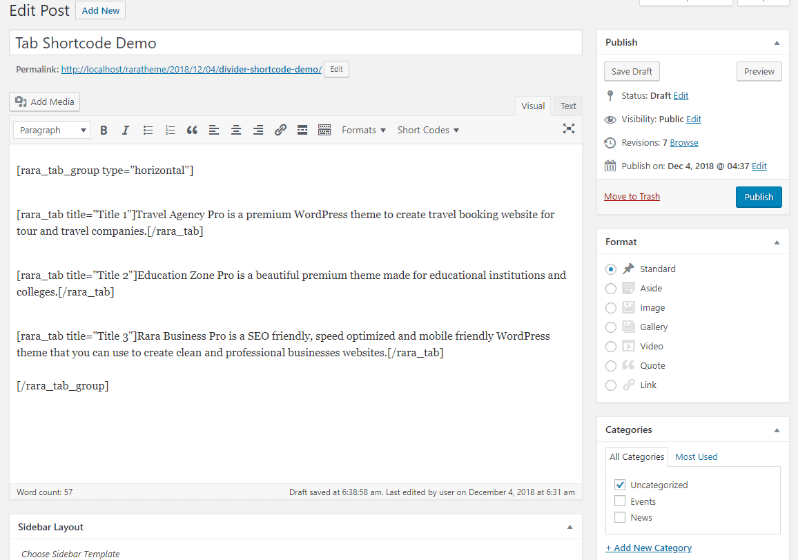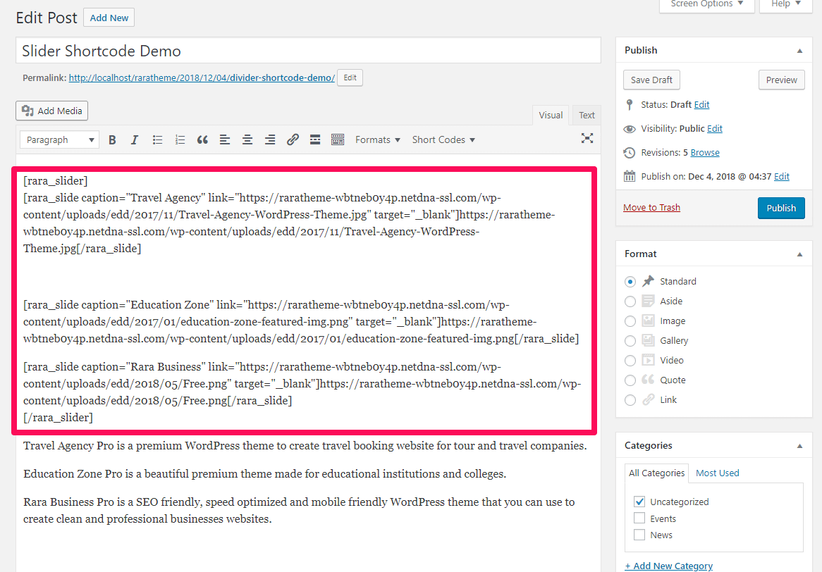 Raraテーマのショートコードを使用するには、次の手順に従ってください。