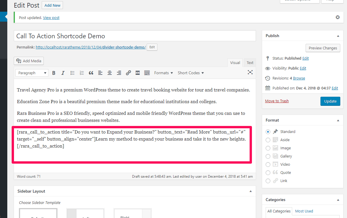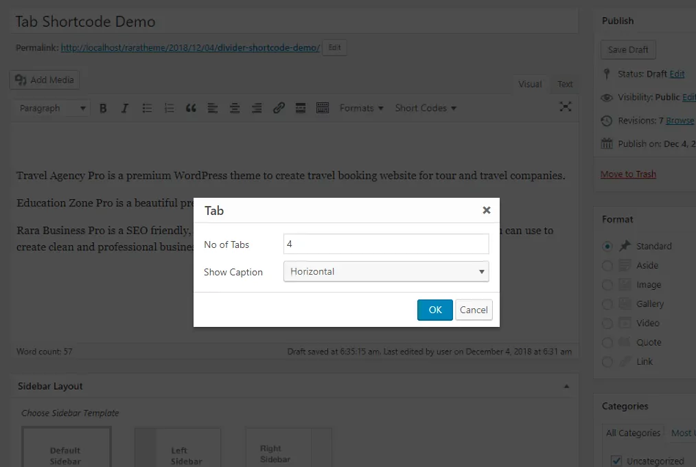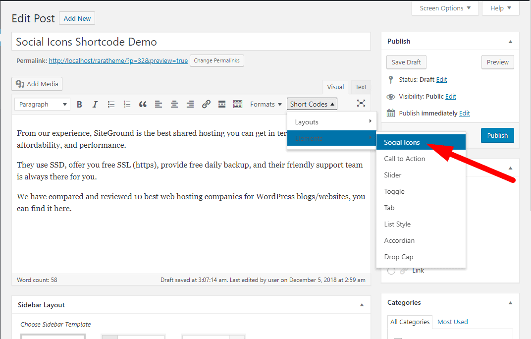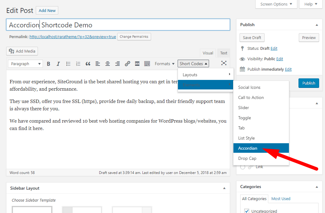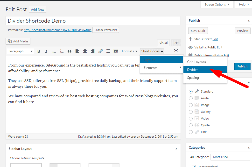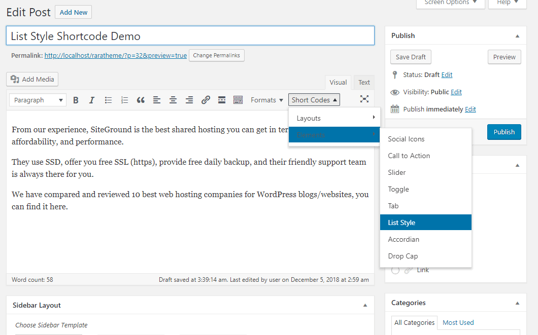 Raraテーマのショートコードを使用するには、次の手順に従ってください。