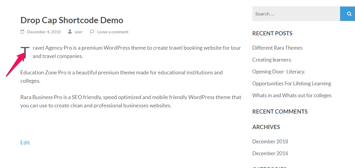 ドロップキャップショートコードのデモンストレーションを以下に示します。
