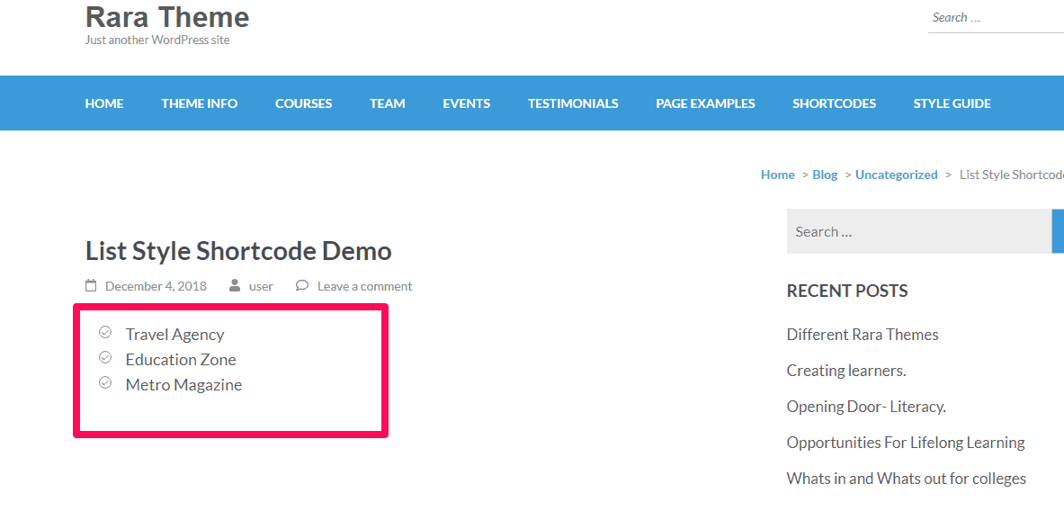 リストスタイルのショートコードのデモンストレーションを以下に示します。