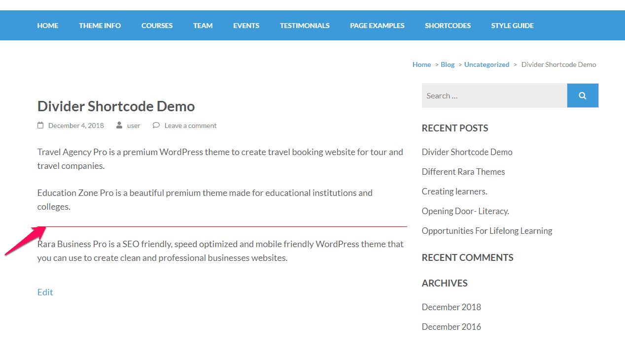 このショートコードを使用して、段落間に分割線を追加できます。 また、仕切り線のカスタムスタイル、太さ、幅、マージンを維持できます。