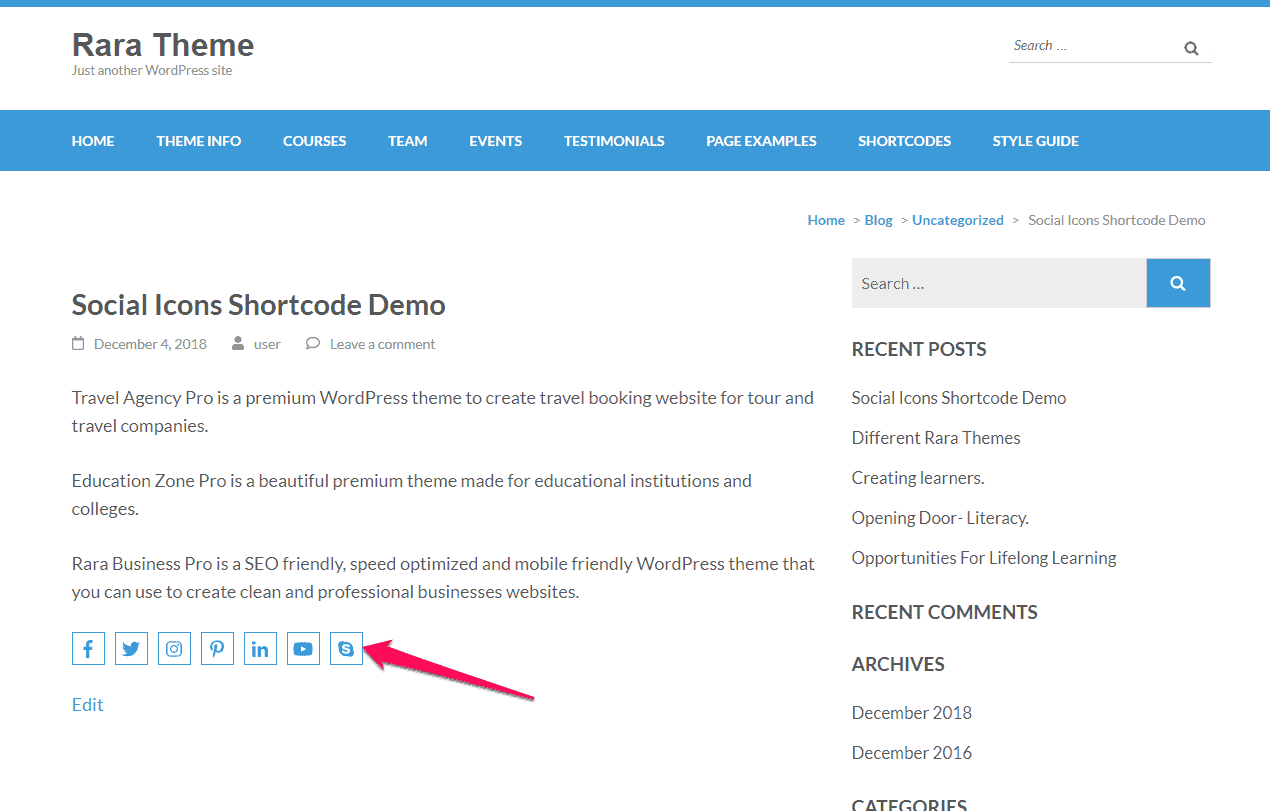 ソーシャルアイコンのショートコードのデモンストレーションを以下に示します。