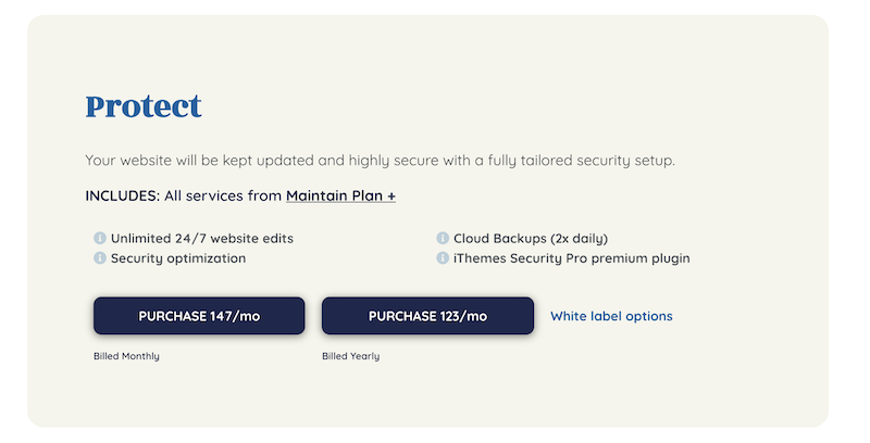WP Buffの価格設定では、中間層の名前はProtectです。 ホワイトラベルサービスにアクセスすると、コストが増加します。 月々の費用だけで行くと、毎月$147.00になります。 一括払いでより多くの節約が得られます。 年間プランは、年間を通して月額たったの$123.00です。 次のティアアップで何を期待できますか?