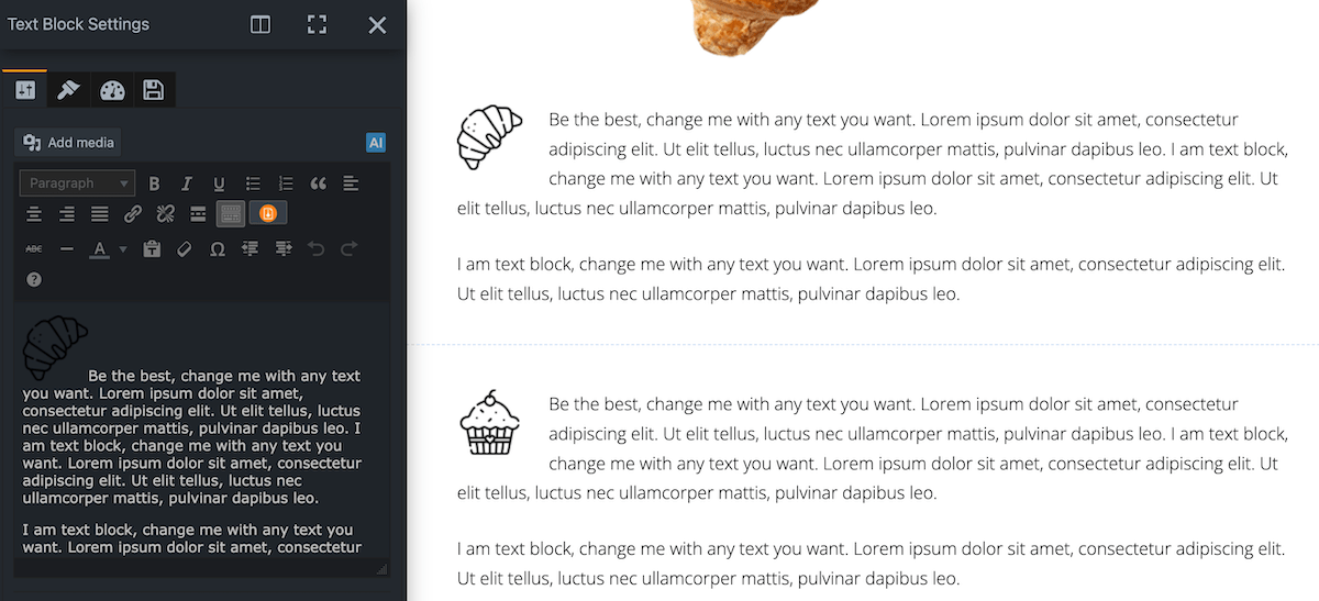 もう 1 つの優れた機能は、組み込みの AI ツールです。 ビルダー内で AI ツールをアクティブにして、書かれたテキスト、画像、さらにはカスタム コードをすばやく作成できます。 ページ上の既存のサイト要素とコンテンツからコンテキストを描画します。
