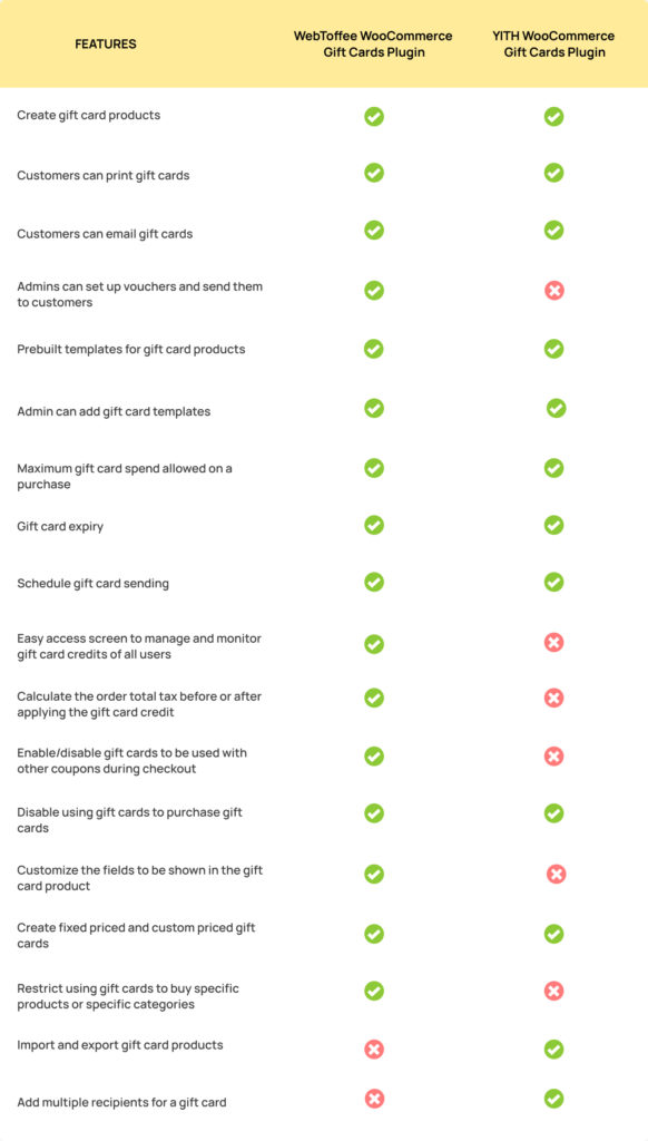 WebToffee ギフト カード プラグインのコア機能と YITH WooCommerce ギフト カード プラグインの機能を比較してみましょう。