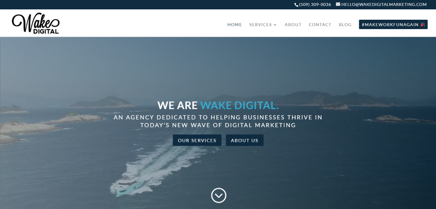 Wake Digital Marketing은 설명 및 CTA가 있는 전체 화면 비디오 배경을 사용합니다. 메뉴에는 CTA도 포함됩니다. 다음은 텍스트가 있는 정보 섹션입니다. 전문 분야에 대한 섹션은 아이콘 및 호버 애니메이션을 포함하는 카드 내의 서비스를 보여줍니다. A Why Us 섹션에는 고객 아이콘 목록과 CTA(연락처 양식 포함)가 이어집니다. 사이트는 깨끗한 디자인을 사용합니다.