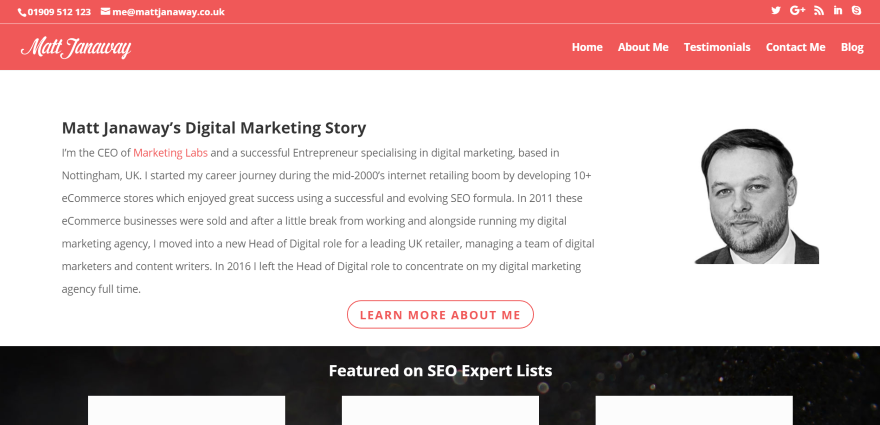 Matt Janaway는 텍스트, 이미지 및 CTA가 포함된 정보 섹션을 표시합니다. 스크롤하면 아이콘과 스니펫이 있는 세 가지 목록에 대한 링크가 표시됩니다. 다음은 경험 및 작업 방식에 대한 정보를 제공하는 섹션입니다. 다음 섹션에는 클라이언트 로고가 있는 슬라이더, 수상, 블로그 게시물, 평가, CTA, 자동 스크롤이 없는 전체 너비 지도 및 문의 양식이 포함됩니다. 이 사이트는 브랜드 색상을 잘 활용합니다.