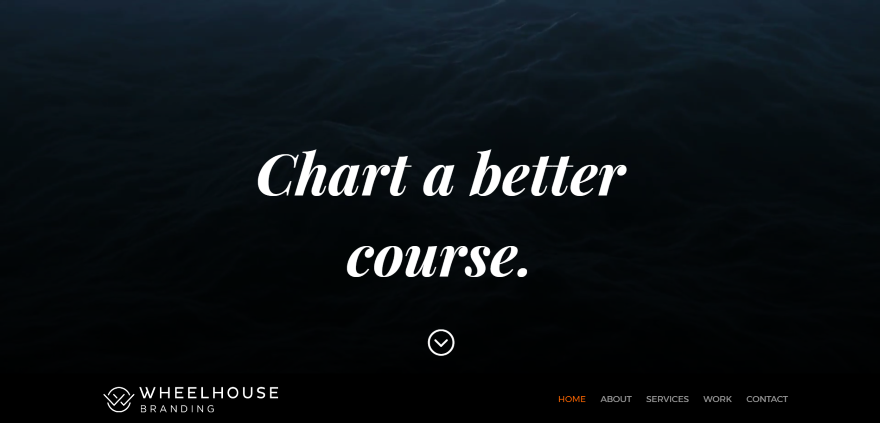 Wheelhouse Branding은 하단에 로고와 메뉴가 있는 태그라인이 있는 전체 화면 비디오 배경을 표시합니다(스크롤 후에도 화면 상단에 남아 있음). 스크롤하면 정보가 포함된 시차로 예술적 지도 배경과 오버레이의 앵커 그림이 나타납니다. 다음 섹션에서는 스크롤링 클라이언트 로고와 작업 방법론, CTA 및 Facebook 팔로우 아이콘이 있는 로고에 대한 설명을 보여줍니다. 페이지는 흑백의 전체 화면 이미지를 사용합니다. 작업 페이지는 호버 애니메이션과 함께 큰 이미지 그리드 내에 사례 연구를 표시합니다.