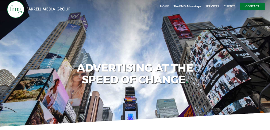 Farrell Media Group은 시차 및 섹션 스타일의 태그라인이 있는 전체 화면 이미지를 표시합니다. 메뉴에는 CTA가 포함됩니다. 스크롤하면 텍스트가 있는 섹션에 대한 전체 너비가 표시됩니다. 다음은 호버 애니메이션이 있는 진정한 시차 서비스가 있는 3열 섹션입니다. 2열 섹션의 한쪽에는 정보가 표시되고 다른 한쪽에는 산업 목록이 표시되고 바닥글에는 연락처 정보가 표시됩니다. 서비스 페이지는 상자 안에 각 서비스의 분석을 표시합니다. 이 사이트는 애니메이션과 섹션 스타일을 잘 활용합니다.