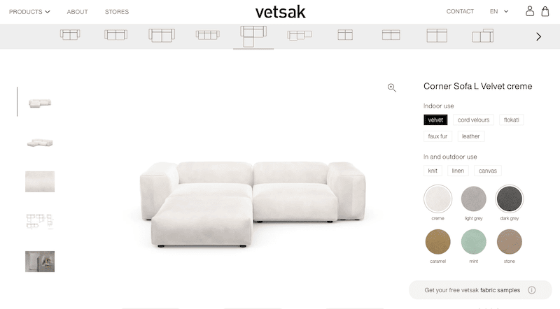 쇼퍼는 소파의 디자인을 좋아할 수 있지만 메인 사진에 제시된 색상은 좋아하지 않을 수 있습니다. 이 경우 주의를 잃지 말고 적절한 색상으로 자신을 투영할 수 있도록 몇 가지 색상 선택기를 제공하십시오.