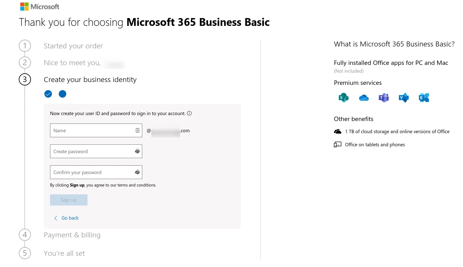 회원가입 버튼을 클릭한 후 결제 정보를 입력하세요. 주문 처리가 완료되면 Microsoft 365 포털에 로그인할 수 있습니다.