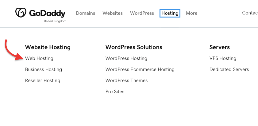 - Godaddy.com으로 이동하여 호스팅을 클릭하면 드롭다운 메뉴에서 웹 호스팅 옵션이 표시되고 해당 옵션을 클릭합니다. 아래 스크린샷에서 볼 수 있듯이.