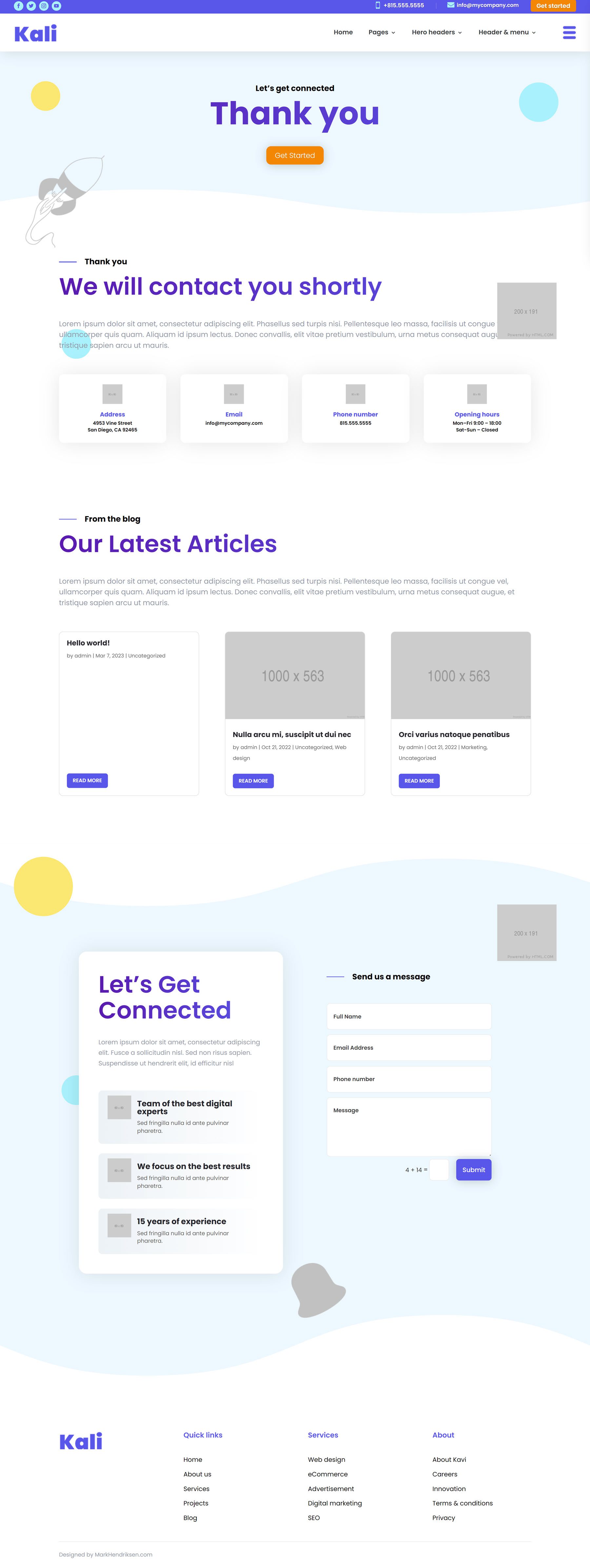문의 양식을 작성하면 감사 페이지로 리디렉션됩니다. 헤더, 텍스트와 이미지가 있는 섹션, 연락처 정보가 있는 광고문, 블로그의 최근 기사 및 연락처 섹션이 있습니다.