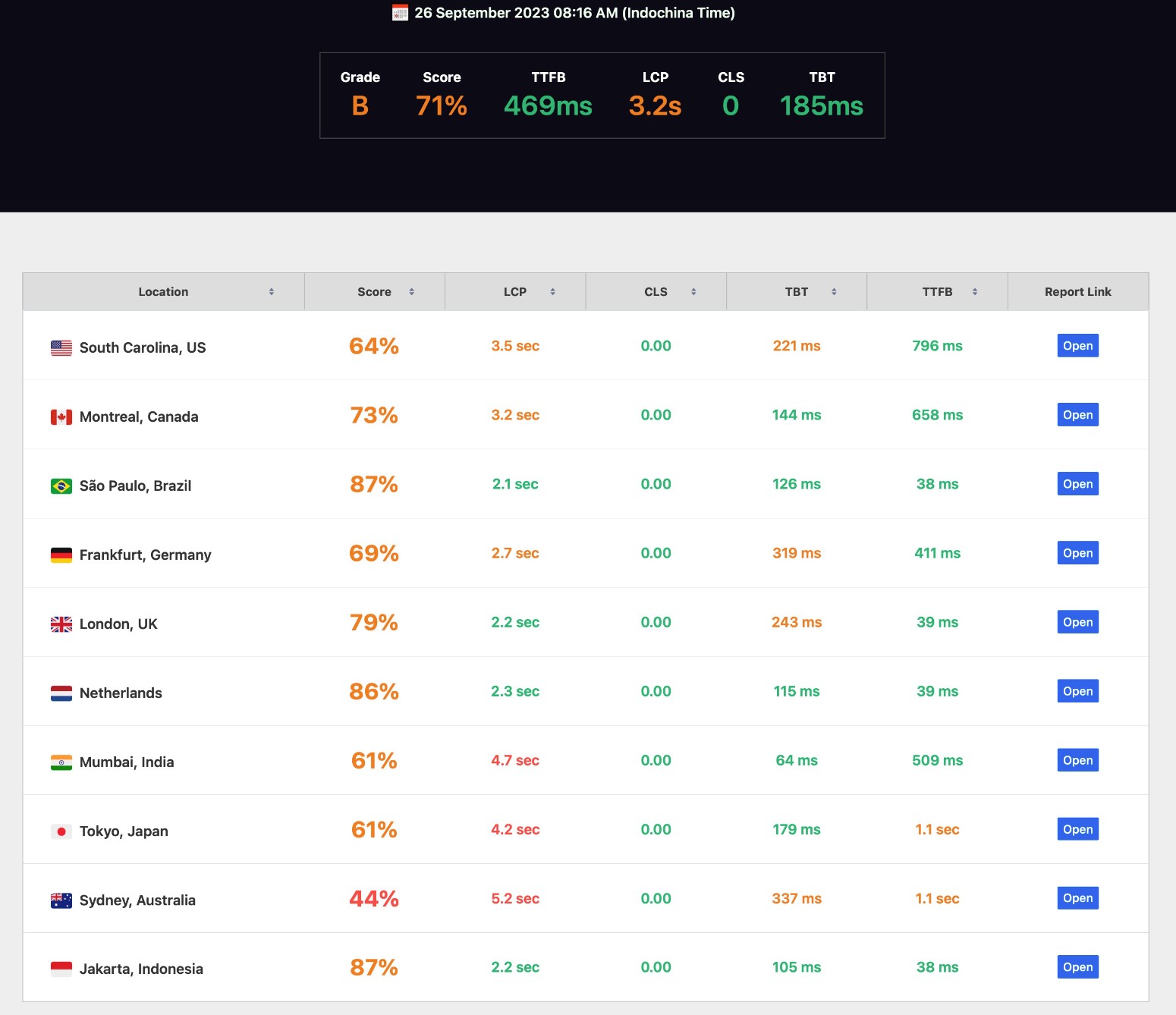 그러나 SpeedVitals에서 테스트했을 때 CDN 캐싱은 약간 불규칙한 것처럼 보였습니다. 일부 위치에서는 빠른 TTFB 및 LCP의 이점을 누리는 반면 다른 위치에서는 약간 느려졌습니다.