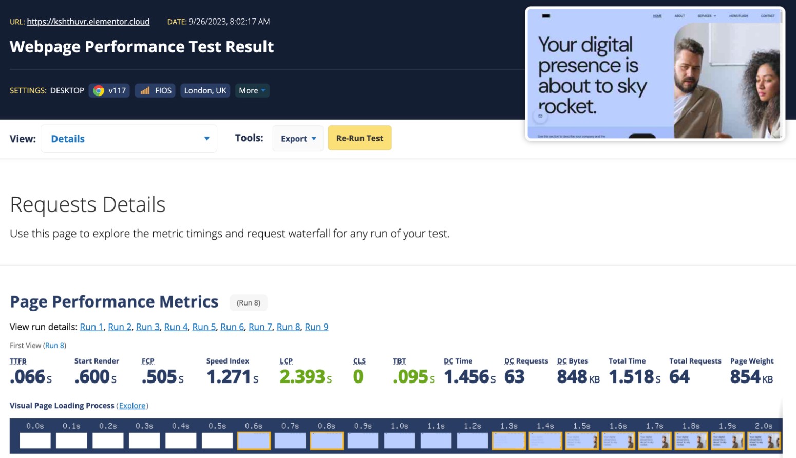 전반적으로 Elementor Hosting은 WebPageTest로 단일 위치 테스트를 실행할 때 좋은 성능을 보였습니다.
